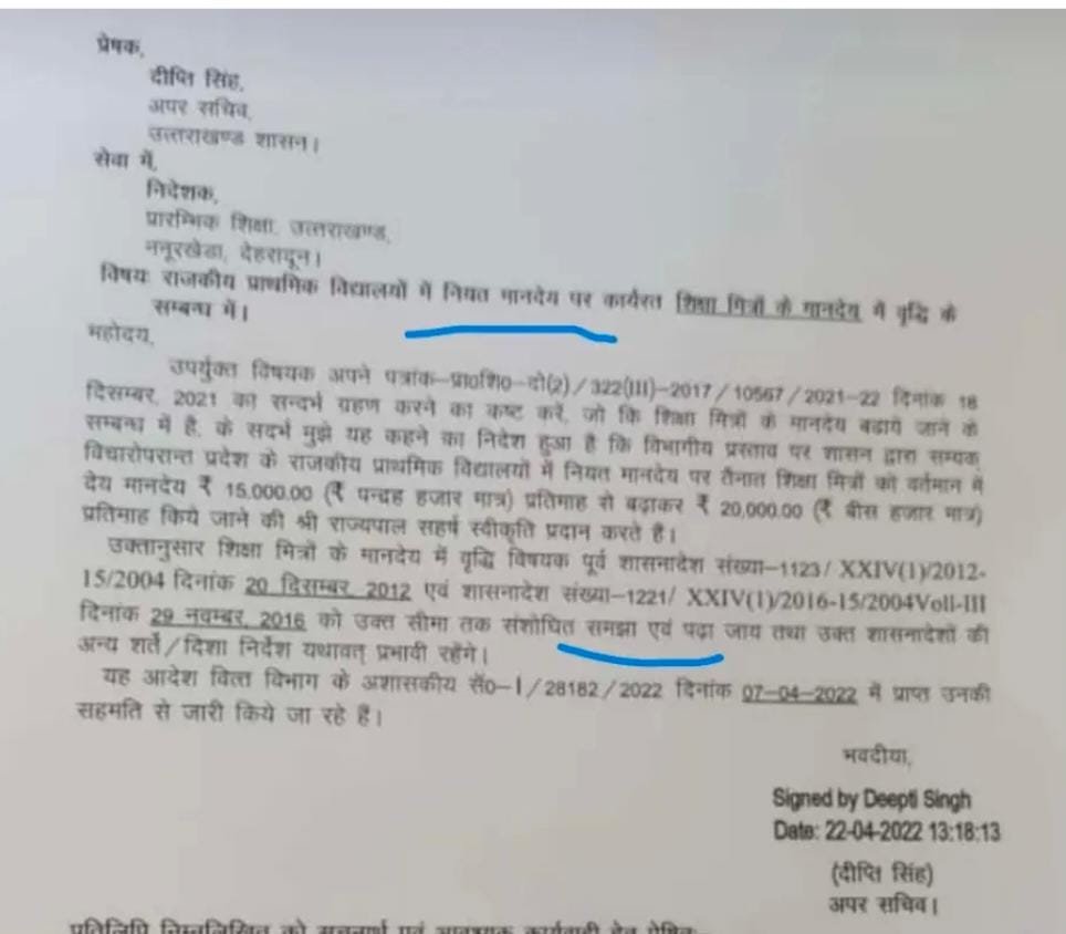 देहरादून- उत्तराखंड में राजकीय प्राथमिक विद्यालयों में नियत मानदेय पर कार्यरत शिक्षामित्रों के मानदेय को बढ़ाया गया है अपर सचिव 31 ने निदेशक प्रारंभिक शिक्षा उत्तराखंड को पत्र लिखकर कहा है, राजकीय प्राथमिक विद्यालयों में नियत मानदेय पर तैनात शिक्षामित्रों को वर्तमान में ₹15000 प्रति माह को बढ़ाकर ₹20000 प्रति माह के जाने का राज्यपाल…
