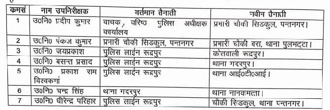 वरिष्ठ पुलिस अधीक्षक डॉ0 मंजूनाथ टीसी महोदय द्वारा जनपद में 07 उप निरीक्षकों स्थानांतरण किए गए हैं l